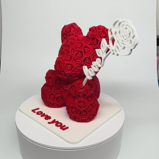 A bear made entirely of roses holding a single rose that says "love" because sometimes you need to be extremely clear about your intentions.